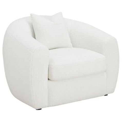 Create a cozy and modern retreat with this sculptural accent chair, designed with soft ivory boucle fabric, a supportive padded back, and a plush thick cushion for everyday relaxation. Its gently sloped armrests, smooth ivory upholstery, and elegant round edges create a calming presence in any living room. A gently curved backrest, firm tight back, and solid wood frame offer lasting structure, while the removable seat cushion and sleek black legs add practical appeal. Whether styled as a natural accent chair or part of a curated home furnishing ensemble, this upholstered accent chair is a refined addition to your home furniture and wooden furniture collection.
