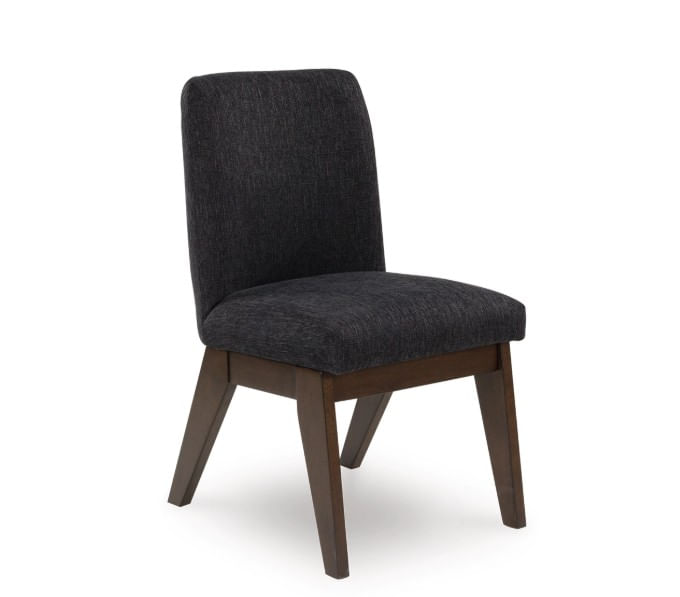 Casual contemporary styling with a decidedly modern vibe. Sitting atop a mid-century inspired base, the Kendamor upholstered bucket dining chair has a rich warm brown finish that beckons everyone to gather around. Black textured upholstery dresses the chair in on-trend elegance. It's a simply stunning show of great taste.