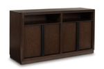 Casual contemporary styling with a decidedly modern vibe. The Kendamor dining server dresses your dining spot in on-trend elegance with its rich warm brown finish. Full-length metal pulls in a matte black tone add a subtly cool touch to spacious storage cabinets. And thanks to its versatile functionality, this four-door piece effortlessly works as a sideboard, entryway table or TV stand. Now there’s a simply stunning show of great taste—wherever you place it.