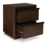 Casual contemporary styling with a decidedly modern vibe. The Kendamor nightstand is warm and inviting with a rich dark brown finish, adorning your restful retreat with on-trend elegance. Full-length metal pulls in a matte black finish add a subtly cool touch to spacious bedside storage drawers. What a simply stunning way to achieve the bedroom of your dreams.