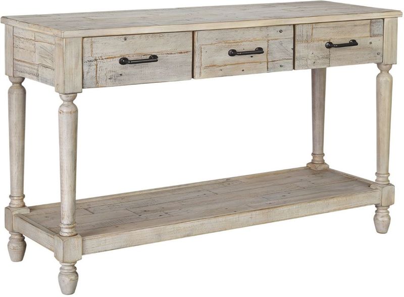 With its distinctive whitewash finish, plank-effect styling and distressed touches that lend natural beauty, the Shawnalore sofa table serves up a delightful twist on farmhouse style. Crafted with reclaimed wood, this sofa table sports three storage drawers and underlying shelf for that much more character.